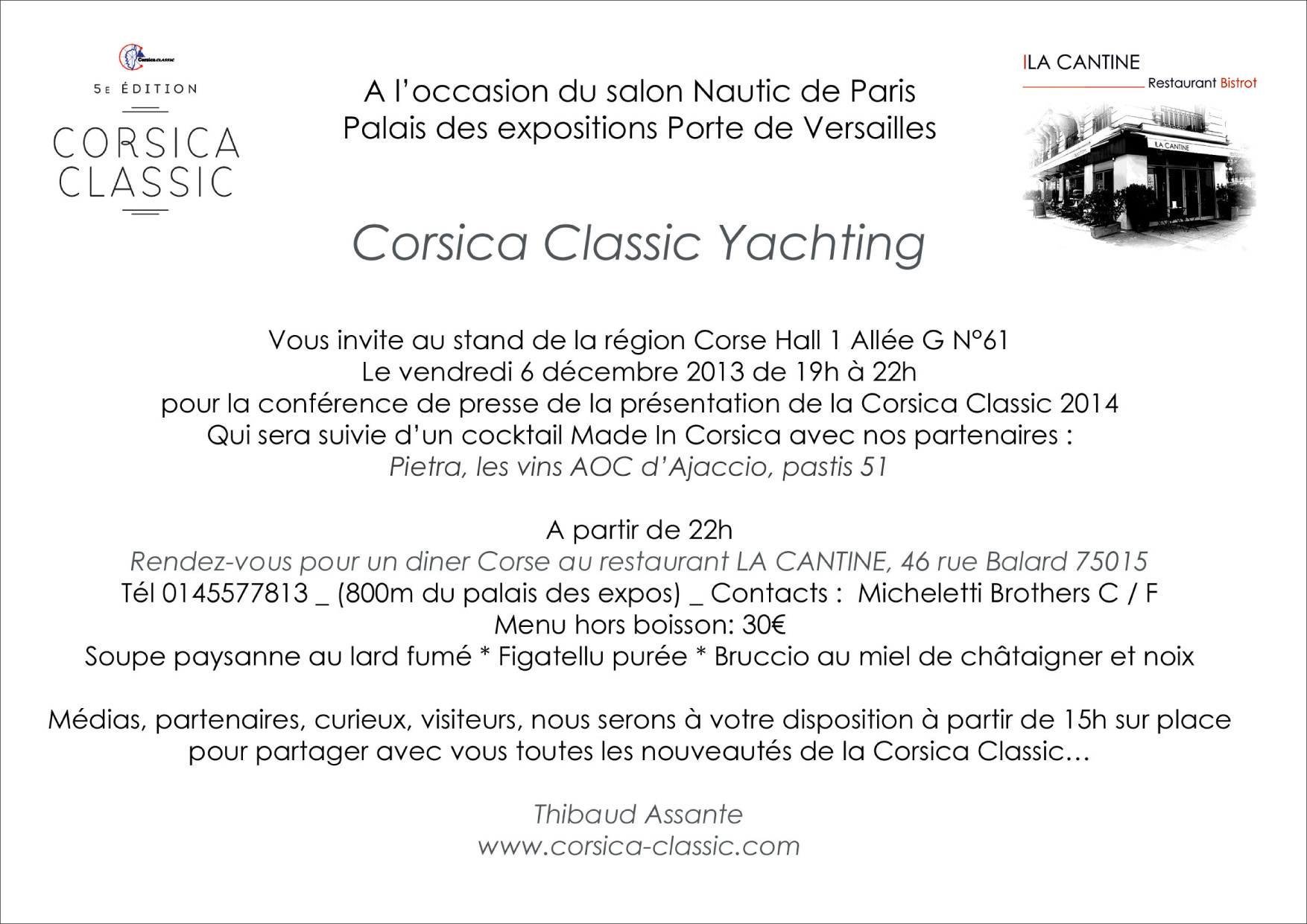 A l’occasion du salon Nautic de Paris Palais des expositions Porte de Versailles, Corsica Classic Yachting vous invite au stand de la région Corse Hall 1 Allée G N°61 Le vendredi 6 décembre 2013 de 19h à 22h pour la conférence de presse de la présentation de la Corsica Classic 2014 Qui sera suivie d’un cocktail Made In Corsica avec nos partenaires : Pietra, les vins AOC d’Ajaccio, pastis 51...